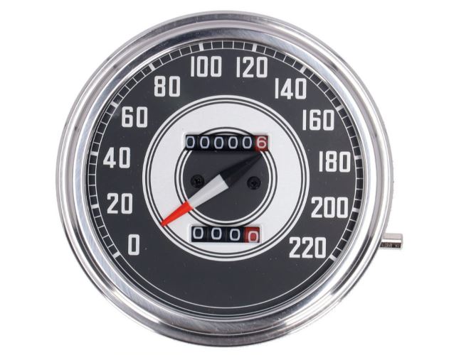 Most FL type speedometers are available with K.M.H. or M.P.H faces. All speedometers from the '36-40' face to the '00-03' face styles feature same dimensions and fit the FL, FLH, Fat Bob, FLST, FXST etc. tank mounted style dash. Note that a small modification to the dash, to fit the re-set knob correctly, may be required. 2:1 ratio is suitable for most front wheel drive, 1:1 drive ratio is suitable for most transmission drive models. 84-95 Softail models may have a different 2.24:1 ratio, of which there are listed a few speedometers.