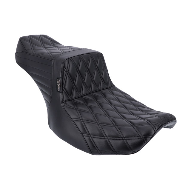 Rider seat area 12.25" wide, passenger seat area 7.75" wide. Double Diamond stitch upholstery. Built with LePera’s Marathon Foam on a steel base plate for maximum stability and comfort. The whipped tail improves passenger lower back support. That, combined with theunrivaled high arching back support for the rider makes this a serious in contender when it comes to a mix of style and comfort.