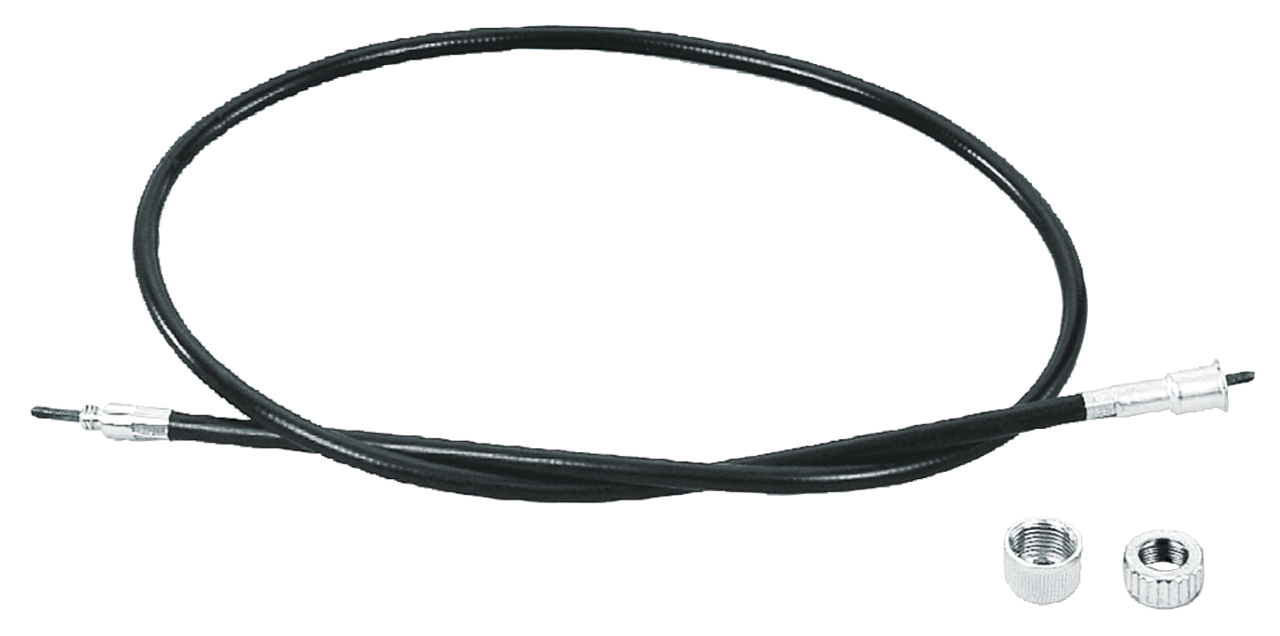 This unique front wheel drive speedo cable allows you to combine any of our large FL style 2:1 speedometers, including our latest FL style speedo with built-in tacho. Each cable comes complete with 2 cable to speedo head nuts to fit either the large FL speedo with 5/8" fitting or the FX/XL 1982 and later style metal cased  speedo with 16mm fitting. Also replaces the OEM cable on FXWG and FXST 1984. May be used on FL 1941-1984 with front wheel driven speedometers and when our Fat Bob style tank is installed on the FXR and XL . Stock length is 38 1/2" (98cm).