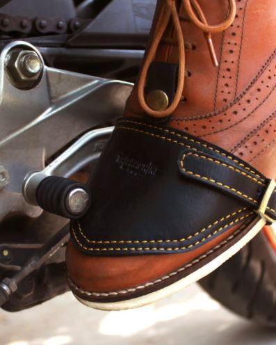 Keep your shoes protected from dirt and grease on the gear shifter with this Trip Machine Shoe protector. Detailed specs: 100% leather, all leather construction, adjustable leather strap premium suede lining to prevent any damage to the shoe, comes with a cotton sack to store the shoe protector after riding. Available in black and tobacco brown.