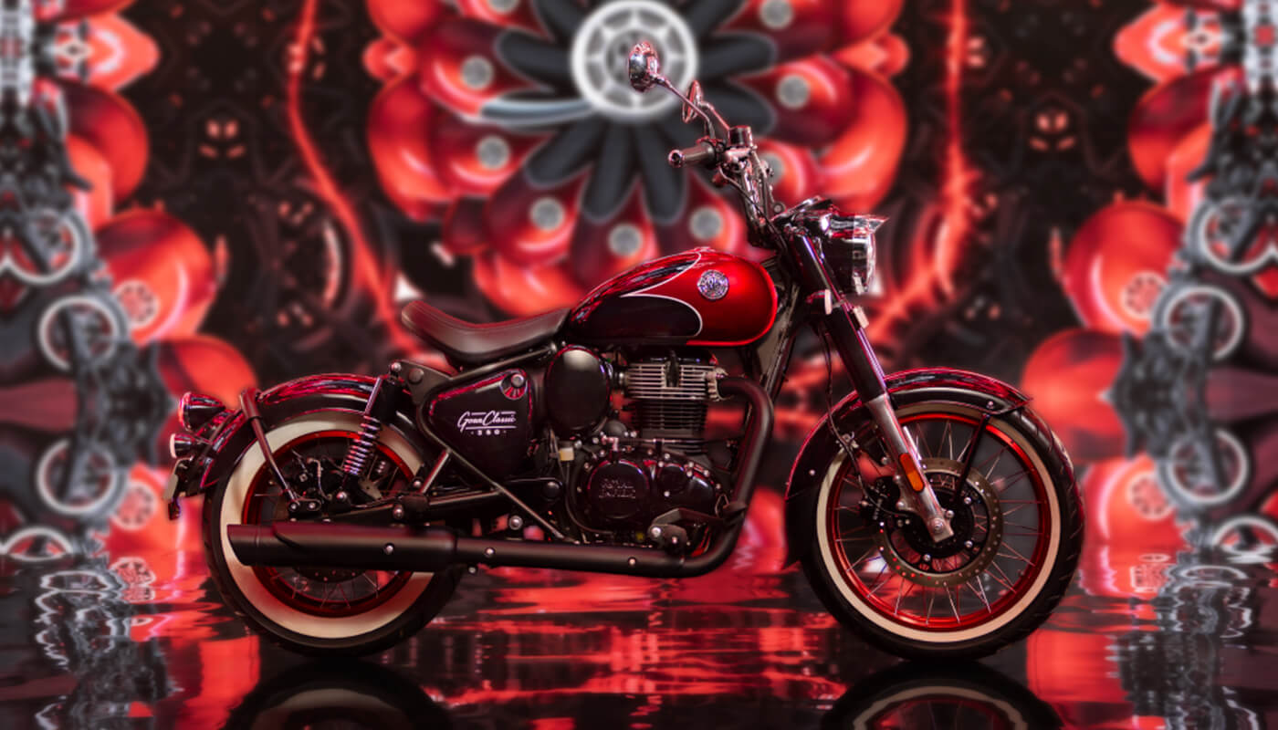Royal Enfield Goan Classic 350 Rave Red er et smukt møde mellem tradition og modernitet – hvor håndværk, farve og form går op i en højere enhed. Den ikoniske Classic 350-platform er kendt for sin silkebløde motor, sine harmoniske proportioner og sin ro på vejen – og i denne farvevariant får den et nyt, livligt udtryk.