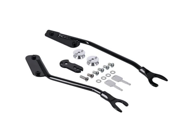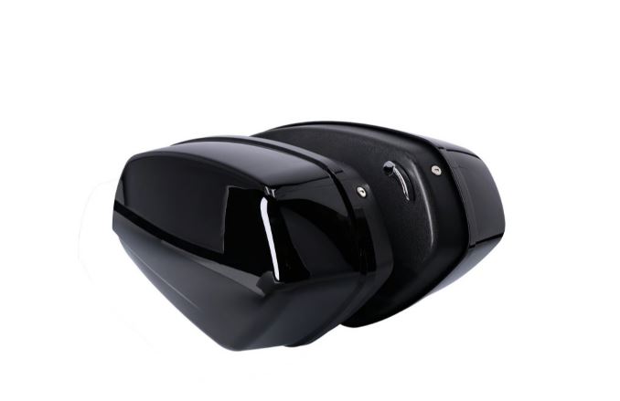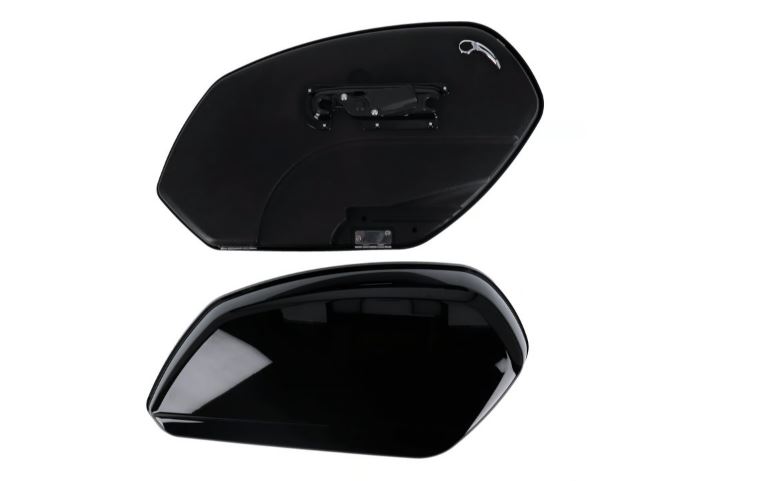 Gloss black unpainted ABS and fiberglass construction. Lid is installed on a hinge, for easy one-hand use, even with rider on-bike. Quick detach mechanism for easy on-off. Bags are mounted to the bike on the inside and lids can be key-locked. Total volume 50 liter. Complete with detachable docking mounting hardware kit. OEM replacement reference 90202534DH. Note: FXLR, FXLRS models require 938871 (OEM 52300645) docking hardware kit and removal of OEM rear turn signals or use of OEM 67801349 turn signal relocation kit.