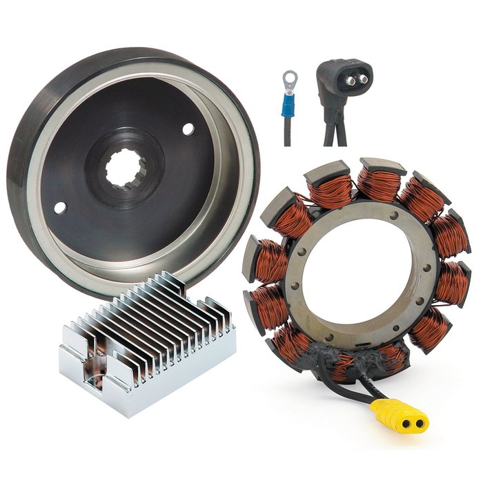 32 Amp kit. High quality components to replace stock parts. Rotor, stator & Regulator/rectifier kit comes as a complete kit with Accel's Heavy Duty rotor, alternator stator and chrome plated regulator. The rotor is made with a special stainless steel alloy enclosure to protect magnets from coming loose and getting damaged or getting damaged by debris. Extra wide splines. Compatible with stock components. Nothing else needed to solve your charging issues.
